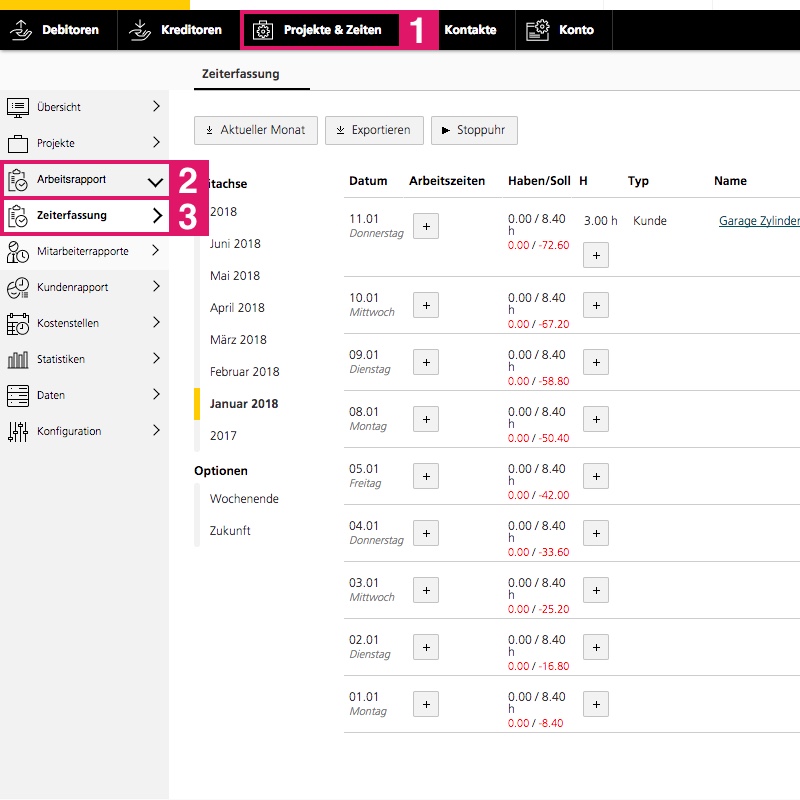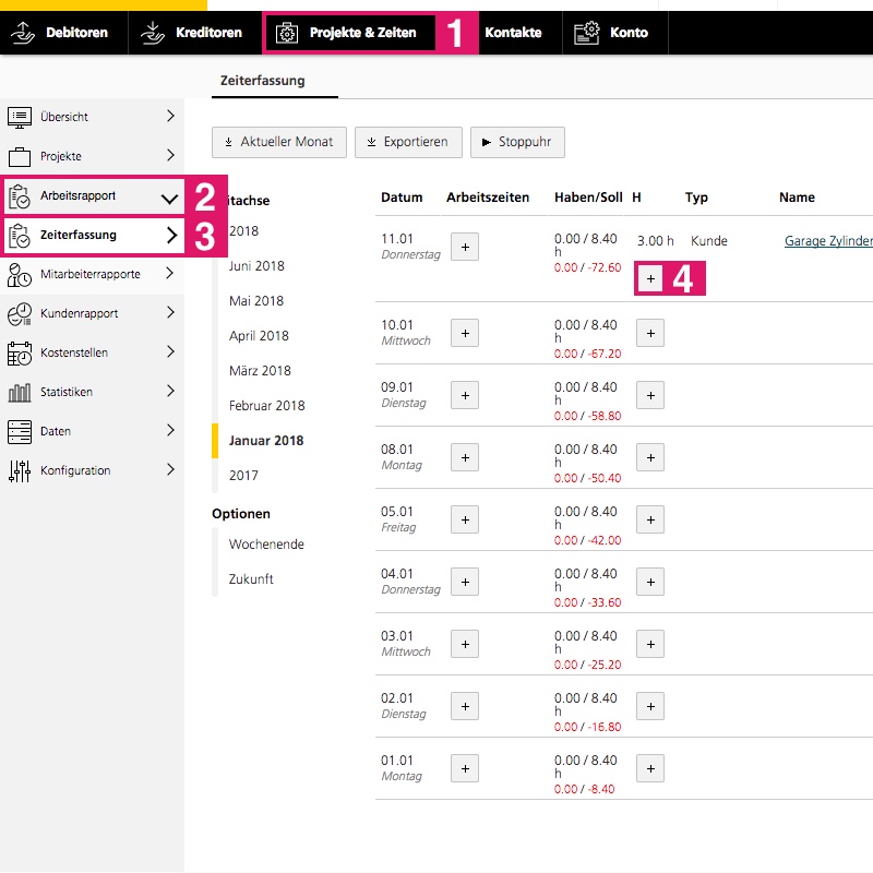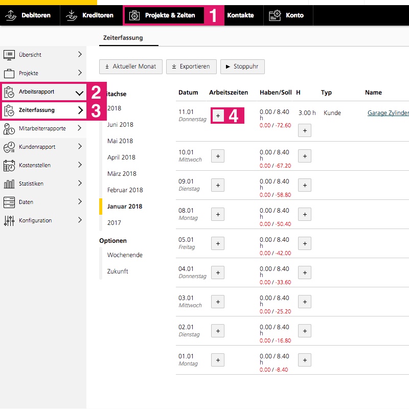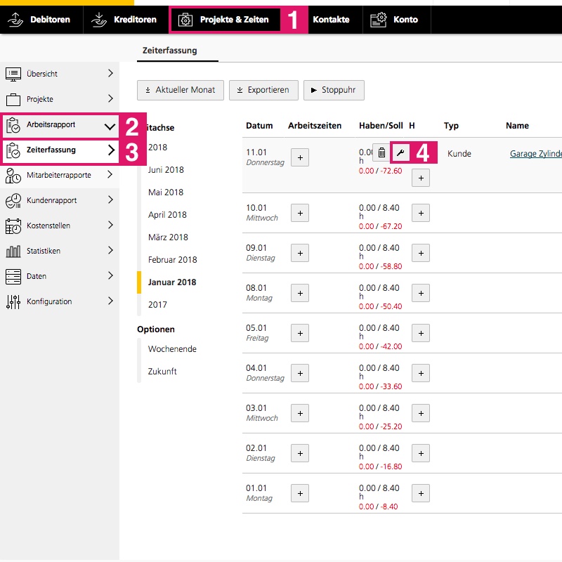 Pour modifier vos propres données de temps, allez dans «Projet et heures» > «Rapport de travail» > «Saisie du temps».