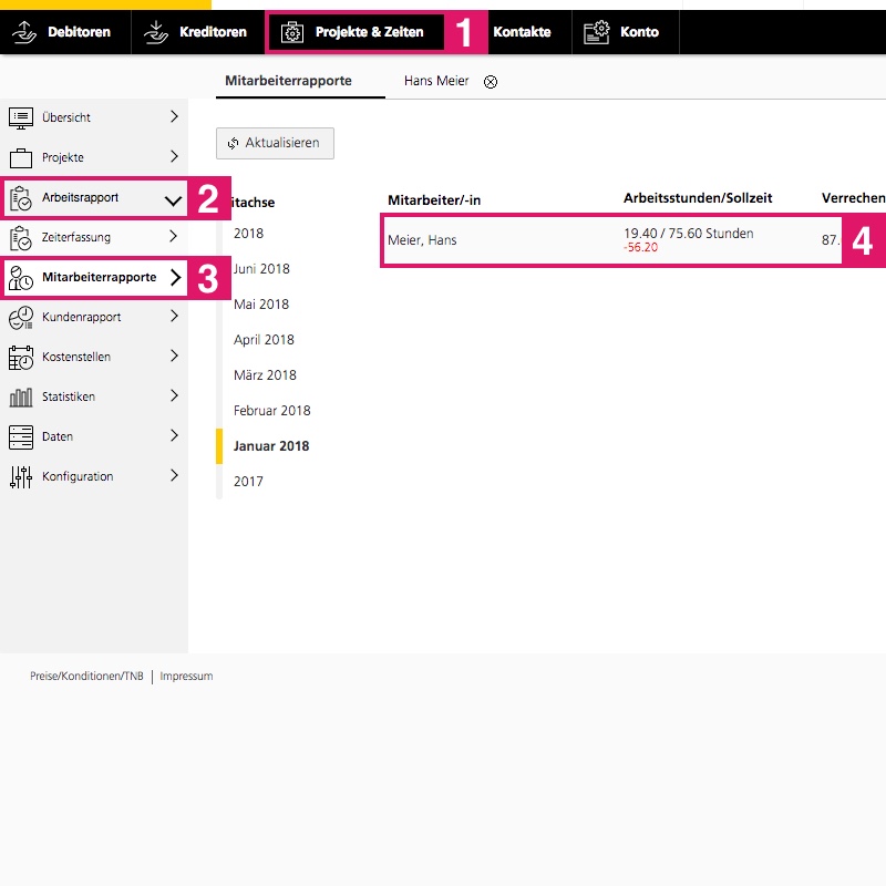 Les rapports de temps des collaborateurs peuvent être consultés sous «Projets et heures» > «Rapport de travail» > «Rapports collaborateur».