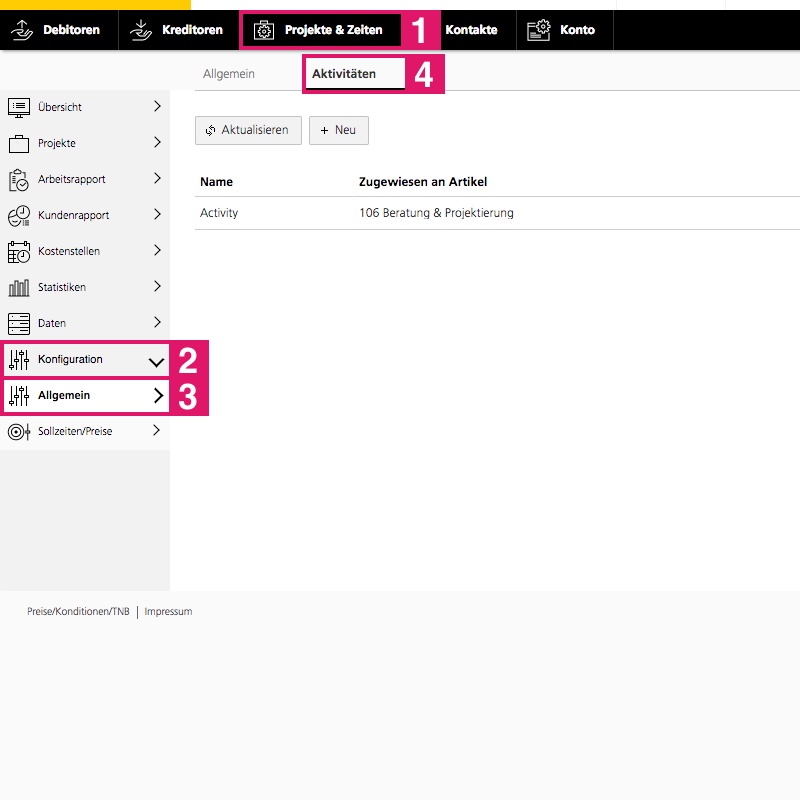 Sous «Projets et heures» > «Configuration» > «Généralités» > «Activités», vous trouverez une vue d’ensemble de toutes les activités que vous avez consignées.