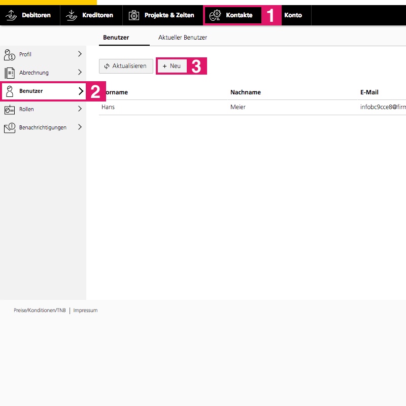 Per la registrazione dell’utente clicchi su «Conto > Utenti». Clicchi poi su «+ Nuovo».